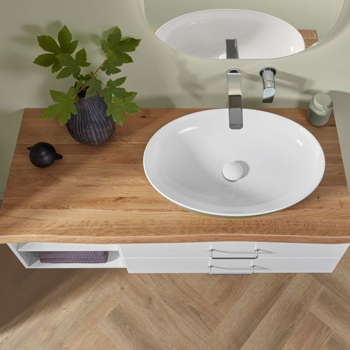 Die 2morrow Massivholz-Platte aus solider Eiche-Hell bringt ein Stück einzigartige Natur ins Bad und ist für den täglichen Einsatz optimal vorbereitet. Dank ihres Lack-Finishs gut geschützt vor Schmutz, Kratzern und Feuchtigkeit ist sie ein dauerhaftes Highlight. Zusammen mit dem unifarbenen Badmöbel und dem Lichtspiegel Reflection LUNA mit seinen weichen Rundungen und der indirekten Beleuchtung entfaltet sich ihr unverwechselbarer Charme.
